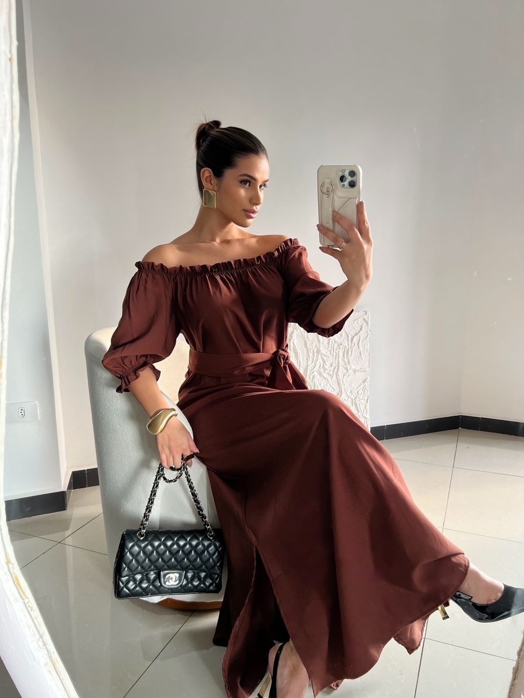 Vestido Cecília longo decote de ombro a ombro , elástico com detalhes de babados , amplo com fendas laterais e bolsos, tecido alfaiataria marrant , estruturado sem perde a leveza do look.